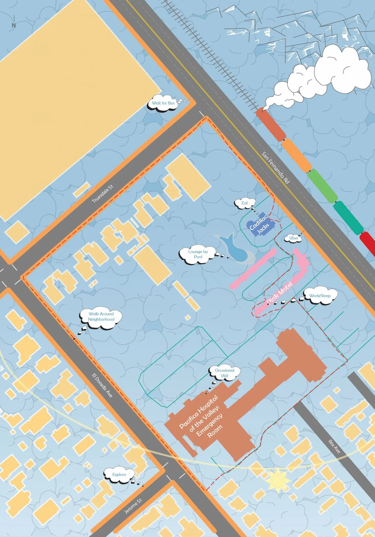 During the peak of the Covid-19 pandemic, there was a shift on how people were allowed to attend work and interact with others. One of the most common ways people would avoid getting sick at work was by working from home virtually. This project is a live/work space created for a fictional character by the name of Stephane Miroux from the movie The Science of Sleep. Stephane spends a large portion of the movie dreaming in some form, so oftentimes, the events occurring in the film are highly unrealistic and playful. This imaginative aspect can be captured in this live/work space created in the Pink Motel located in Sun Valley, California.