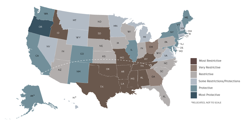 This map expresses the states with restrictions to healthcare access and law severity. The circle graphs shows how this impacts people who may require an abortion.